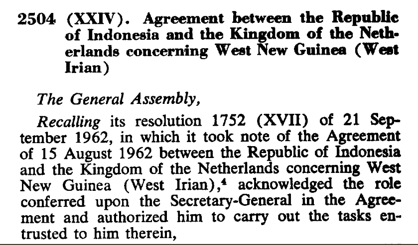 1. Takes note of the report of the Secretary-General and acknowledges with appreciation the fulfilment by the Secretary-General and his representatives of the tasks entrusted to them under the Agreement of 15 August 1962 between the Republic of Indonesia and the Kingdom of the Netherlands concerning West New Guinea (West Irian);