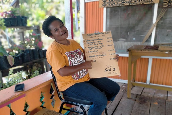 Susana Hanni Felle is showing a learning agenda at the Reading House written in a former cartoon (ANTARA / Musa Abubar)