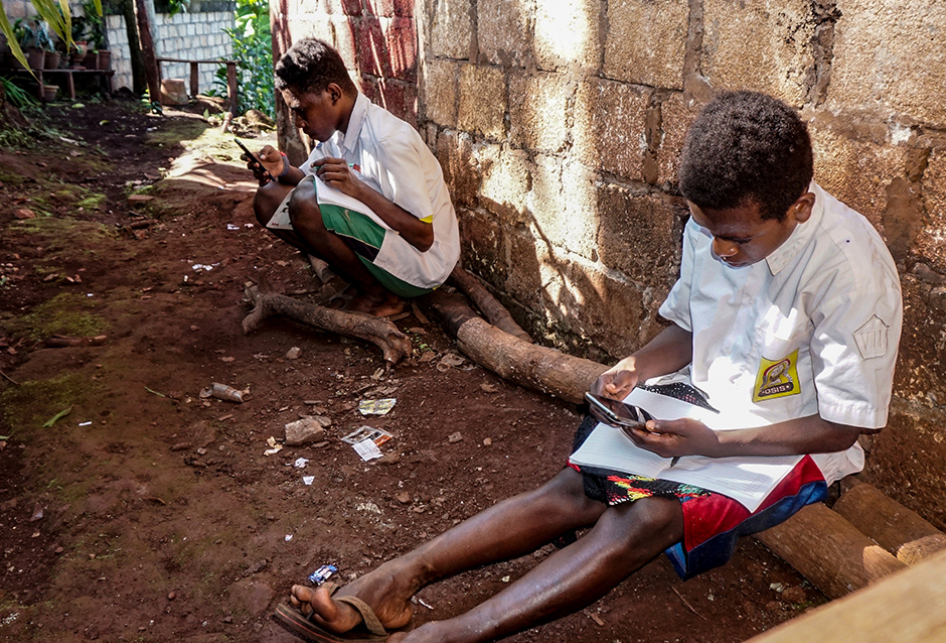 Yonas Kedeikoto (15) and Jekson Pigome (12) attended an online teaching and learning process in Jayapura City, Papua, Monday (10/8/2020). Both of them seemed to focus on the cell phones they were holding, even though their learning locations were far from comfortable. Yonas and Jekson were forced to take part in online learning by sitting on a wooden trunk in a yard outside the house.