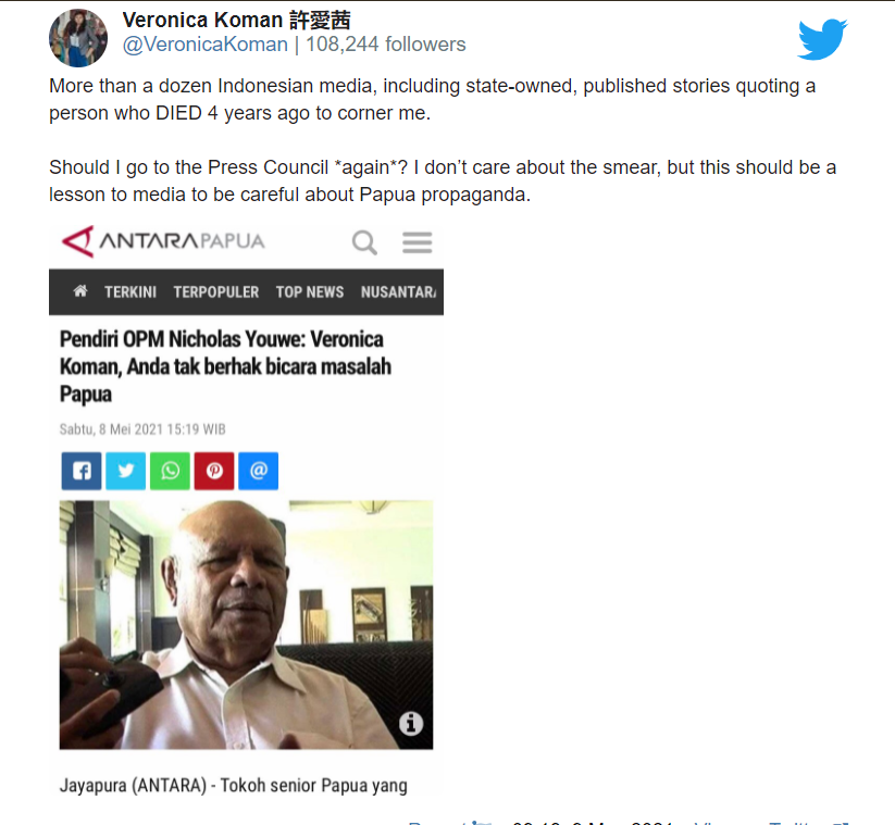 ANTARA News Agency later corrected the mistake by publishing this Pendiri OPM sebut Veronica Koman tak berhak bicara masalah Papua. It seemed that ANTARA journalist mistaken Nicholas Messet with Nicolaas Jouwe (it written Nicholas Youwe). By this correction, we understand how cunning is Veronica with her propaganda by playing victim and maximize it for her popularity on social media.